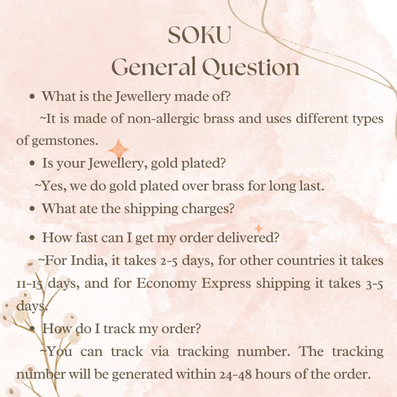 Material: Brass (non allergic )Wipe your jewelry with a soft cloth after every useAlways store your jewelry in a flat box to avoid accidental scratchesKeep sprays and perfumes away from your jewelryDo not soak your jewelry in waterClean your jewelry using a soft brush, dipped in jewelry cleaning solution only