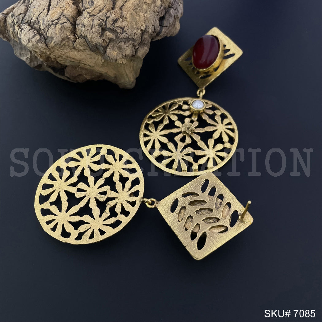 Gold Plated Unique Flower Red Stone and Pearl Handmade Drop and Dangle Earring SKU7085