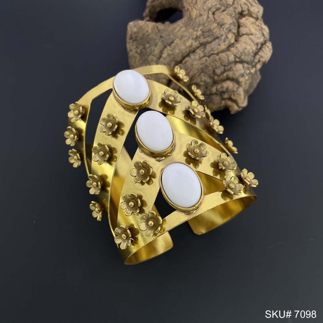 Gold Plated Designer Unique Big Cuff with White Stone and Flower SKU7098