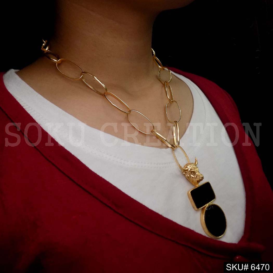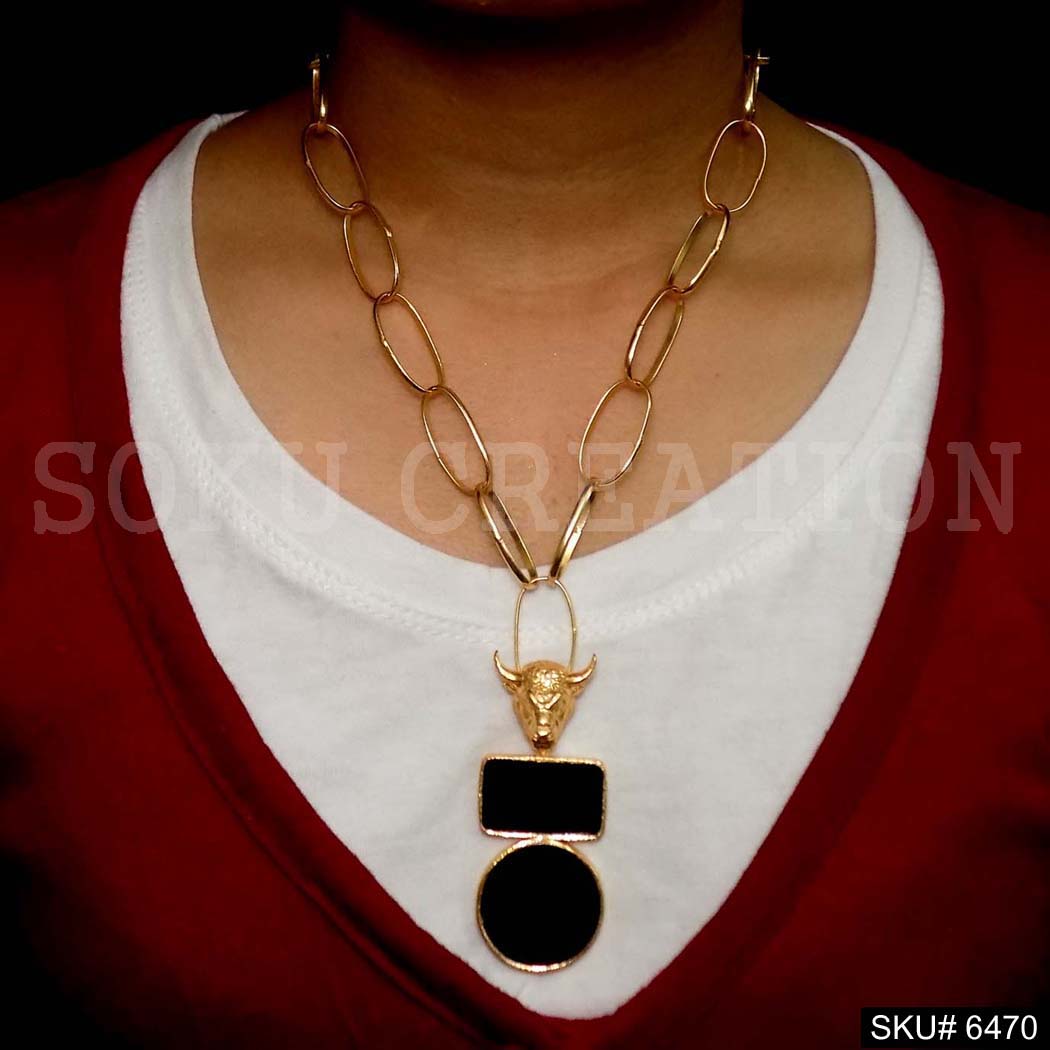 Gold Plated Designer Chain Bull Necklace with Black enamel Necklace SKU6470