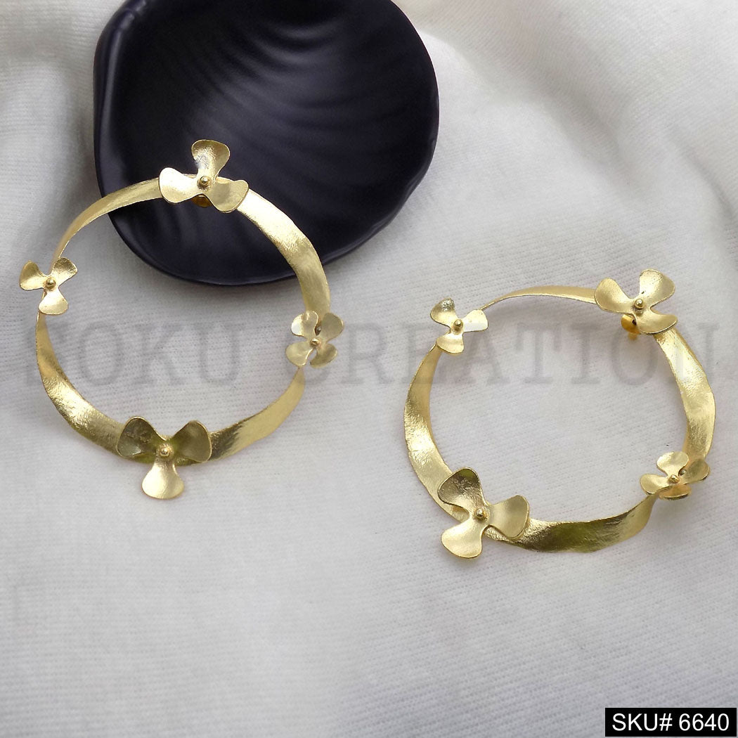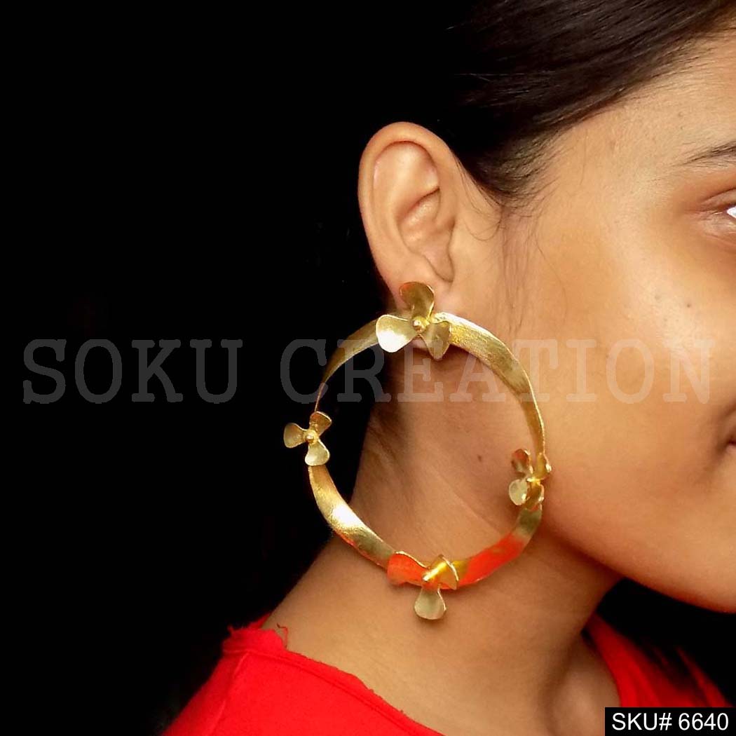 Gold plated Flower on Circle Big Hoops Unique Handmade Design of Stud Earring SKU6640