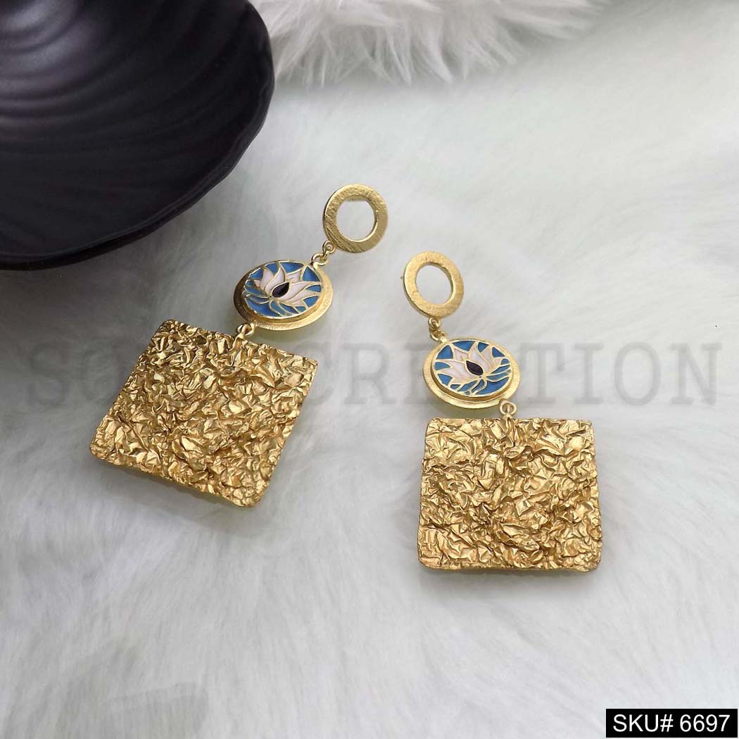 Gold plated Hammered Square Designer Protective Evil Lotus Drop and Dangle Earrings SKU6697