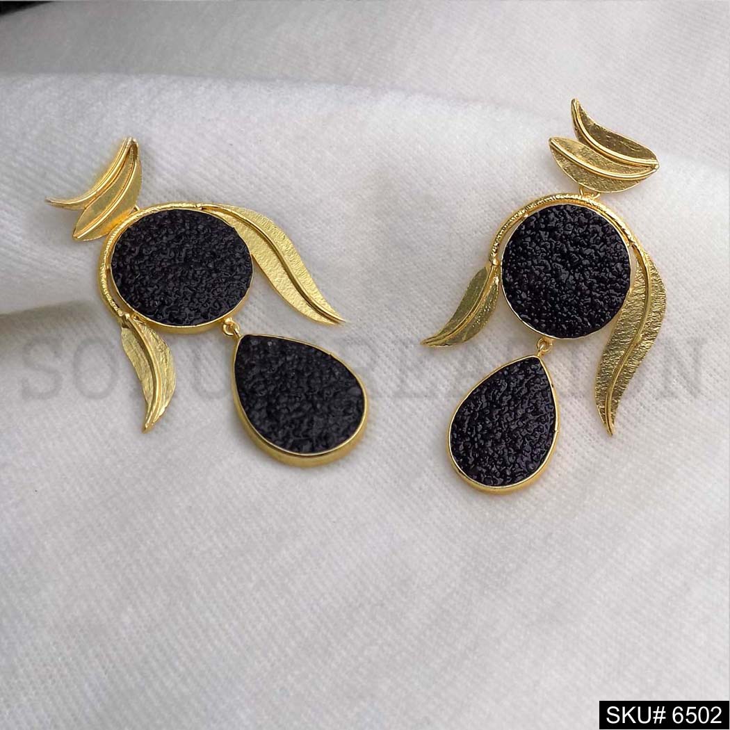 Gold plated Leaves Black Carved Stone Drop and Dangle Earrings SKU6502