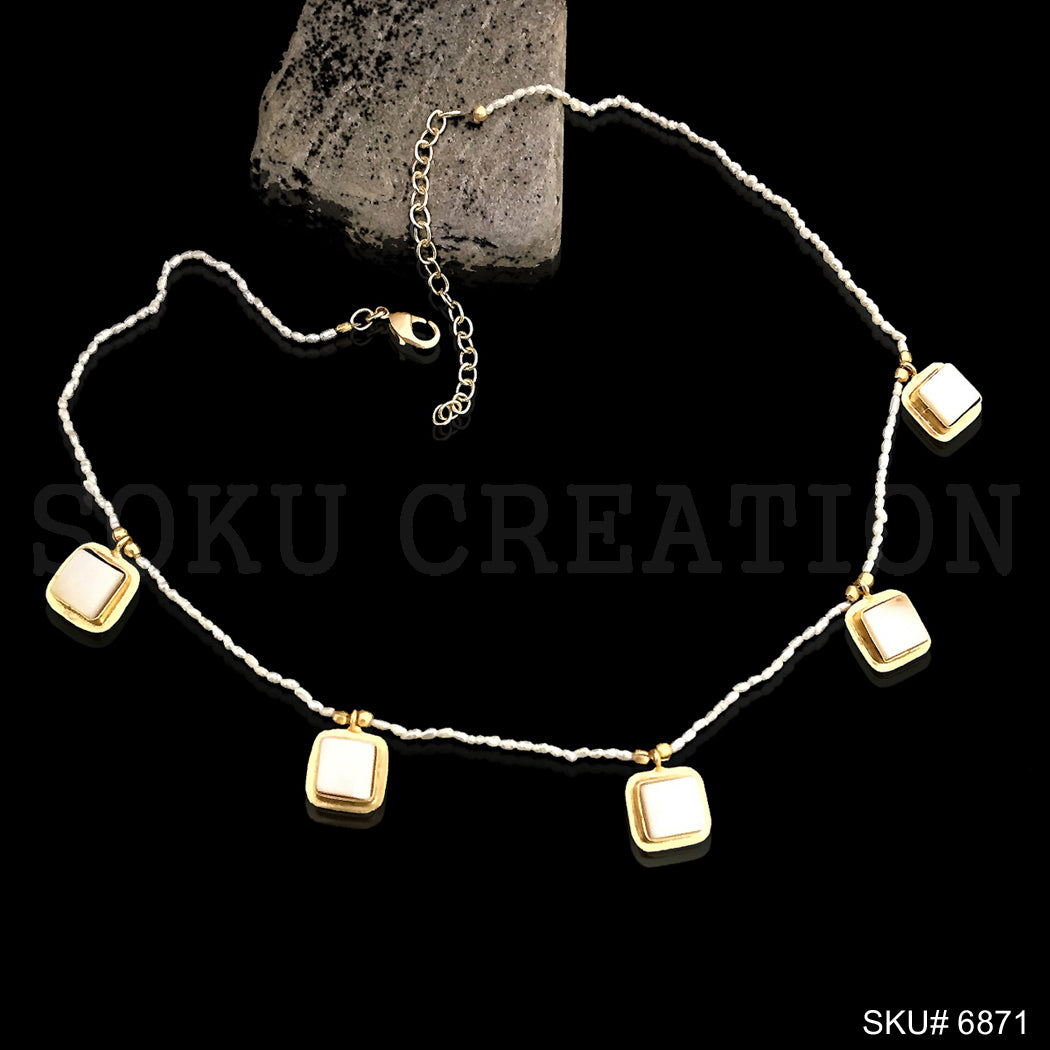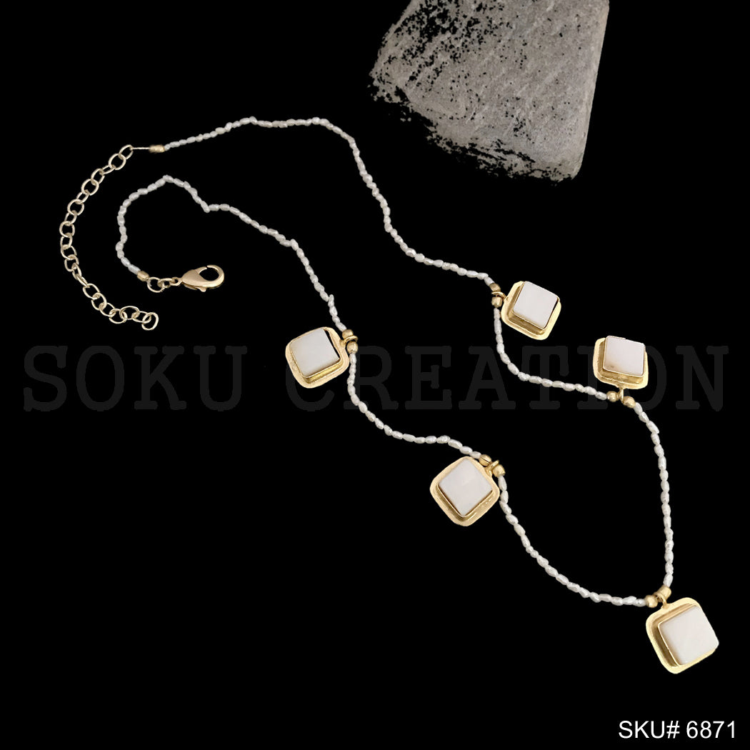Gold Plated Plain Pearl Beads with White Stone Square Shape Charms Necklace SKU6871