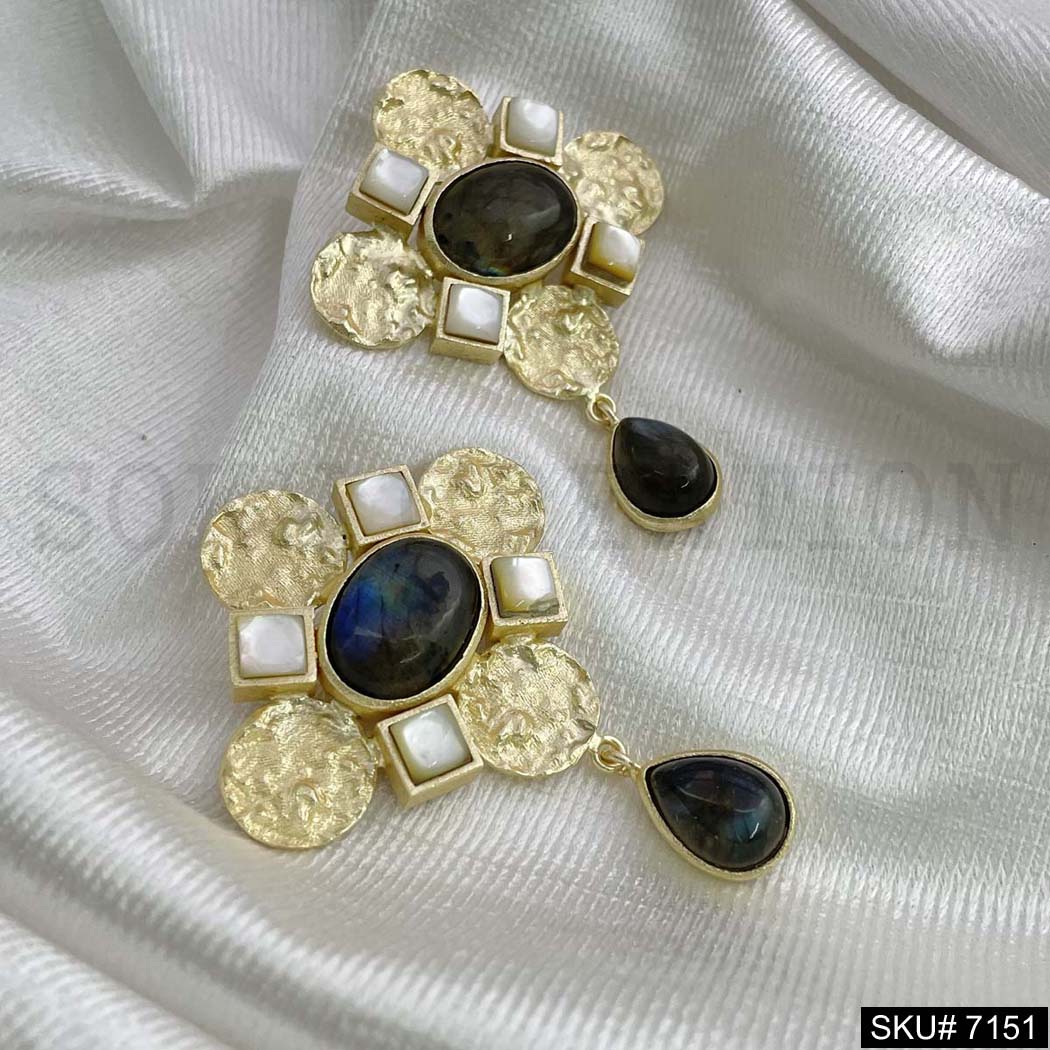 Gold Plated Statement Labra stone Drop Style Hammered Flower Handmade Drop and Dangle Earring SKU7151