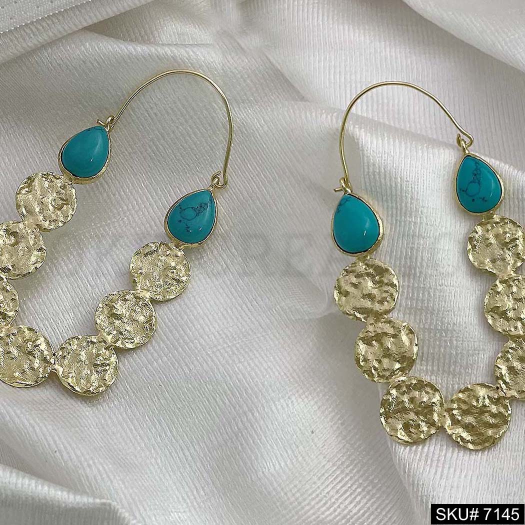 Gold Plated Turquoise Drop Shape Hammered Handmade Hoops Earring SKU7145