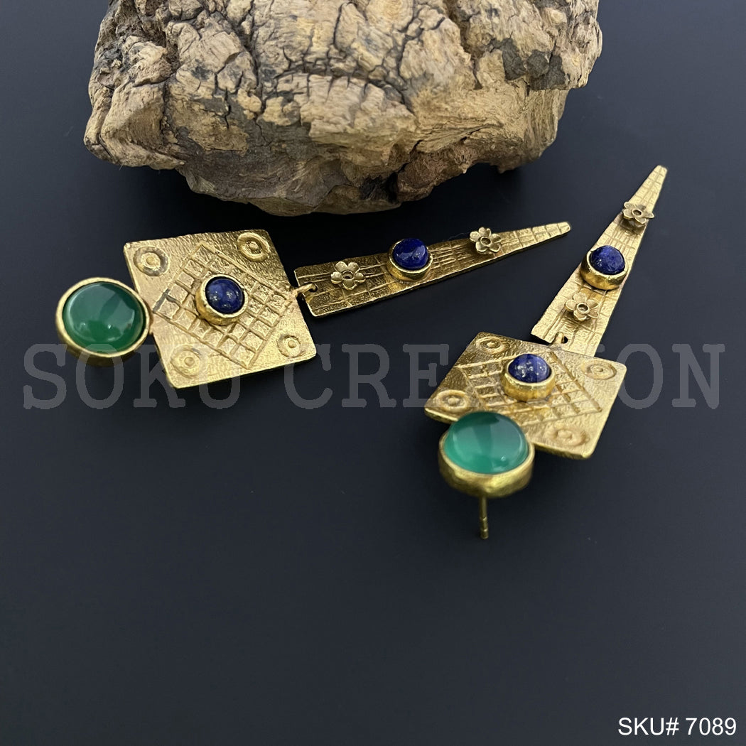 Gold Plated Unique Green Stone Statement Handmade Drop and Dangle Earring SKU7089