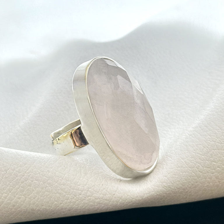 Soft, romantic, and effortlessly refined, this ring features a faceted oval-cut rose quartz set in a sleek sterling silver bezel. The pale pink hue of the stone is enhanced by its translucent quality and multi-faceted surface, catching the light with a delicate shimmer that evokes serenity and love.